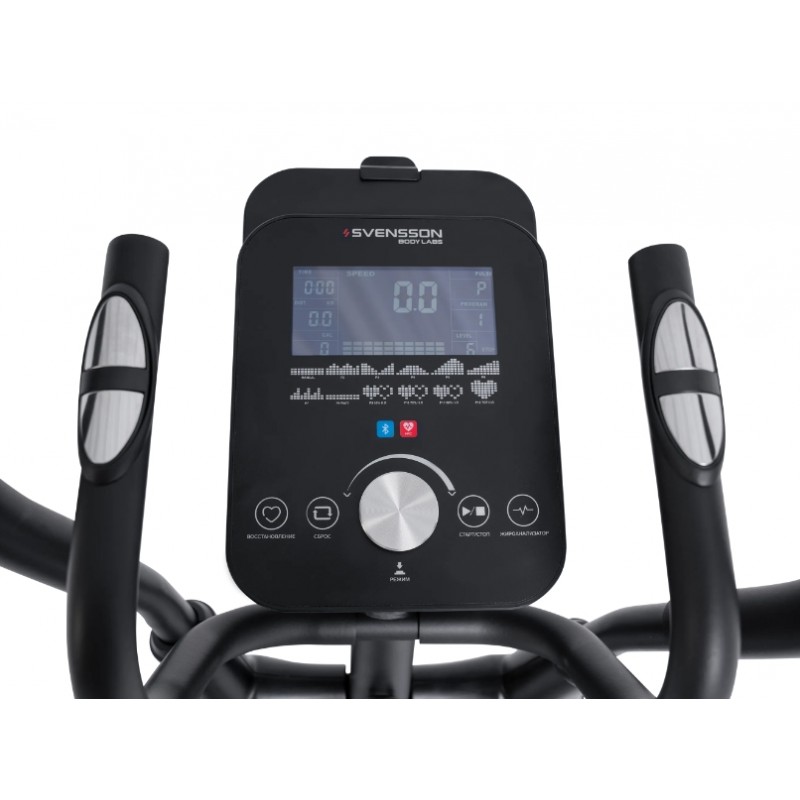 Он оснащен электромагнитной системой нагружения с 16 уровнями нагрузки, что позволяет вам адаптировать тренировки под свои физические возможности и цели. Тренажер предлагает инерционный вес маховика в 24 кг, что обеспечивает плавный и комфортный ход. Расстояние между педалями составляет всего 30 мм, что способствует естественному движению во время тренировки. Длина шага в 500 мм и антискользящие педали увеличенного размера гарантируют безопасные и эффективные занятия. Двухпозиционные нескользящие рукоятки с сенсорными датчиками пульса позволяют контролировать сердечный ритм во время тренировки. Интуитивно понятная консоль и разнообразие программ Консоль с LED-дисплеем белой индикации отображает время, скорость, дистанцию, пульс, уровень нагрузки, калории и обороты. С 12 программами тренировок, включая ручной режим, предустановленные и пульсозависимые, вы сможете разнообразить свои занятия. Возможность подключения к тренировочным мобильным приложениям (Kinomap™, Fitshow™) через Bluetooth добавляет элемент интерактивности и мотивации. SVENSSON BODY LABS FORGE сделает ваш домашний фитнес не только более доступным, но и эффективным!